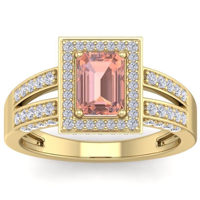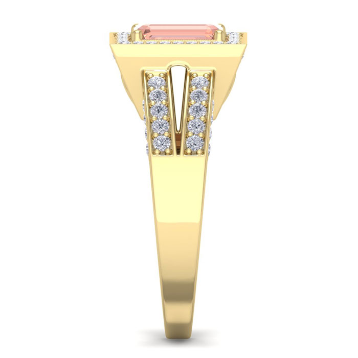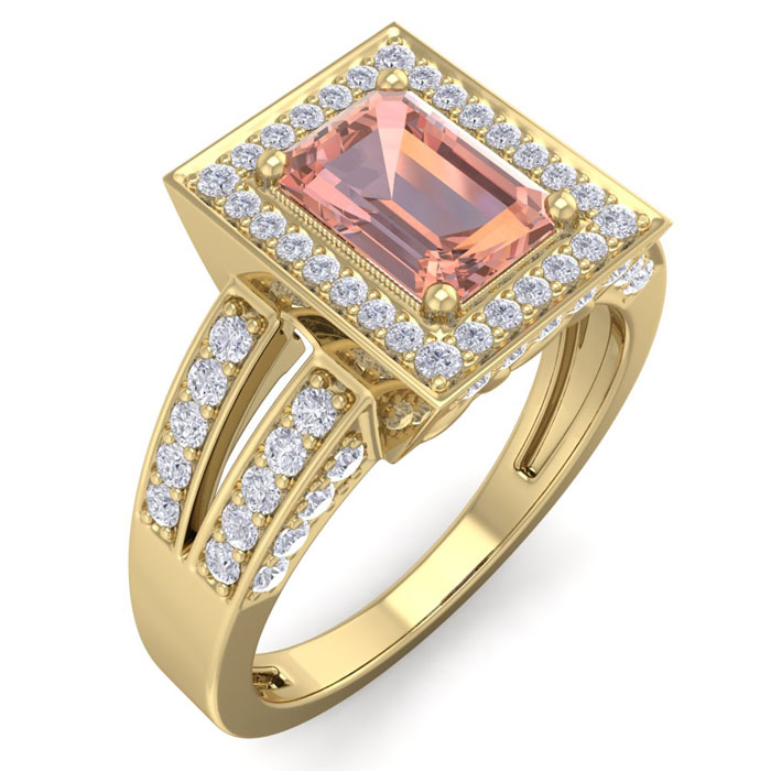 This morganite ring features one 7x5mm emerald cut morganite gemstone at approximately 9/10 carats. It is surrounded by 74 sparkling diamonds in I-J color, I1-I2 clarity at 2/3 carat total weight. Total gem weight is approximately 1-1/2 carats. This ring is in 14 karat yellow gold.