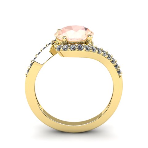This morganite ring features one 8x6mm oval shape sideways morganite gemstone at 1-1/7 carats. It is surrounded by 30 sparkling diamonds in a halo in I-J color, I1-I2 clarity at 1/3 carats. Total gem weight is 1-1/2 carats. This ring is crafted in 14 karat yellow gold.