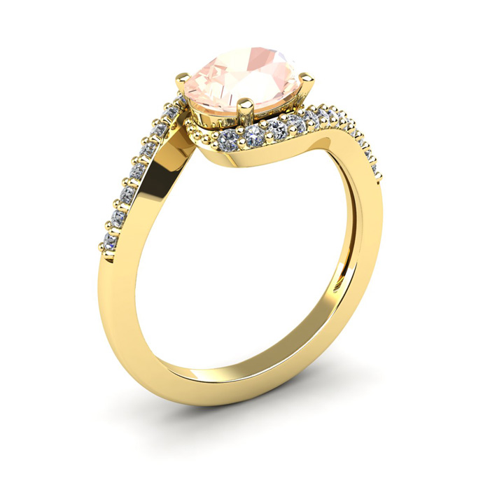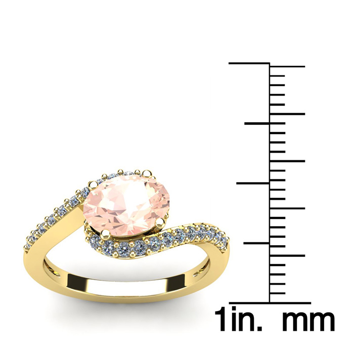 This morganite ring features one 8x6mm oval shape sideways morganite gemstone at 1-1/7 carats. It is surrounded by 30 sparkling diamonds in a halo in I-J color, I1-I2 clarity at 1/3 carats. Total gem weight is 1-1/2 carats. This ring is crafted in 14 karat yellow gold.