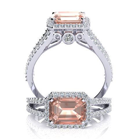 This morganite ring features one 7x5mm emerald shape morganite gemstone at 9/10 carats. It is surrounded by 72 sparkling diamonds in a halo and down the band in H-I color, I1-I2 clarity at 2/5 carats. Total gem weight is 1-1/3 carats. This ring is crafted in 14 karat white gold.
