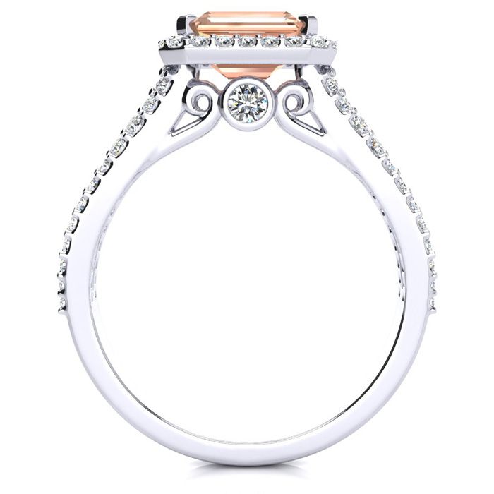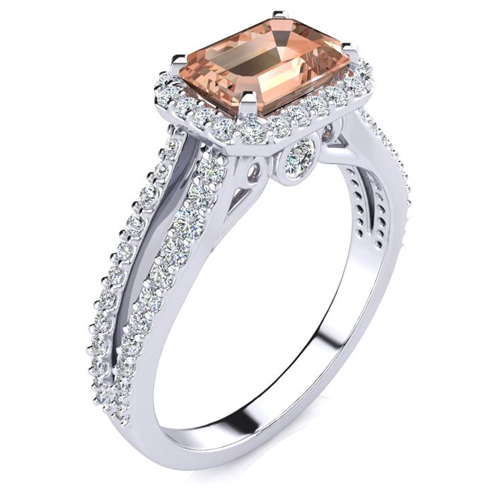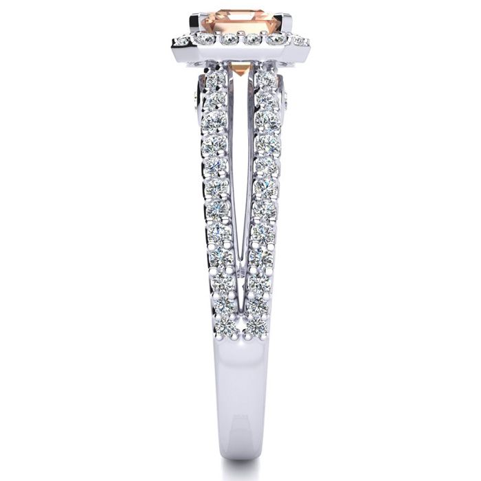 This morganite ring features one 7x5mm emerald shape morganite gemstone at 9/10 carats. It is surrounded by 72 sparkling diamonds in a halo and down the band in H-I color, I1-I2 clarity at 2/5 carats. Total gem weight is 1-1/3 carats. This ring is crafted in 14 karat white gold.