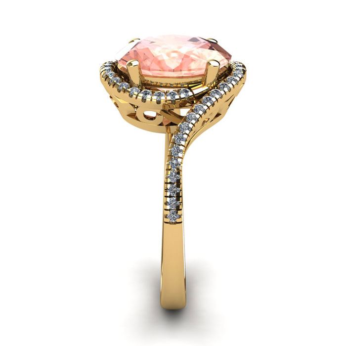 This morganite ring features one 8x6mm oval shape morganite gemstone at 1-1/7 carats. It is surrounded by 48 sparkling diamonds in a halo and down the band in H-I color, I1-I2 clarity at 1/4 carats. Total gem weight is 1-1/3 carats. This ring is crafted in 14 karat yellow gold.