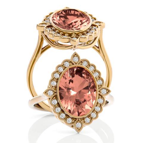 1-1/3 Carat Oval Shape Morganite and Halo Diamond Ring In 14 Karat Yellow Gold