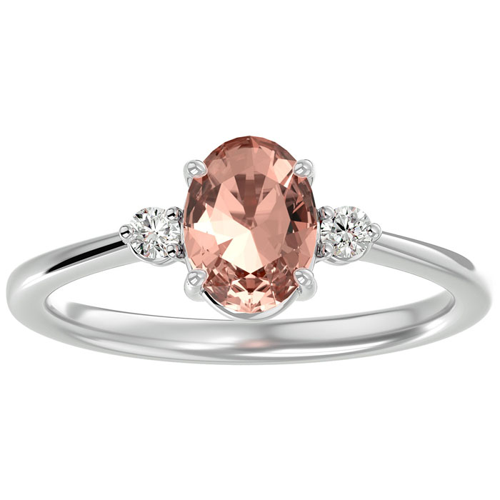 This morganite ring features one 8x6mm oval shape morganite gemstone at approximately 1-1/7 carats. It is surrounded by 2 sparkling diamonds in I-J color, I1-I2 clarity at 1/10 carat total weight. Total gem weight is approximately 1-1/4 carat total weight. This ring is in 14 karat white gold.