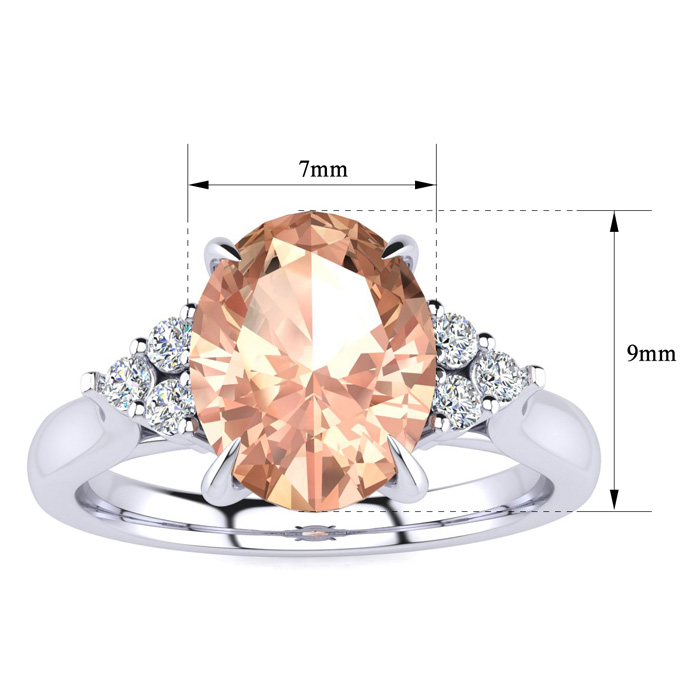 This morganite ring features one 9x7mm oval shape morganite gemstone at 1-3/4 carats. It is surrounded by 6 sparkling diamonds in I-J color, I1-I2 clarity at 1/10 carats. Total gem weight is approximately 1-3/4 carats. This ring is crafted in 14 karat white gold.