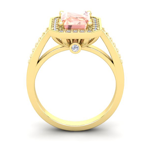 This morganite ring features one 7x5mm emerald shape morganite gemstone at 9/10 carats. It is surrounded by 40 sparkling diamonds in a halo and down the band in I-J color, SI2-I1 clarity at 1/4 carats. Total gem weight is 1 carats. This ring is crafted in 14 karat yellow gold.
