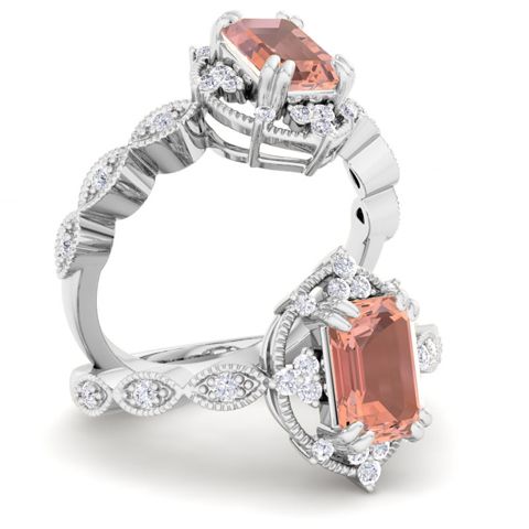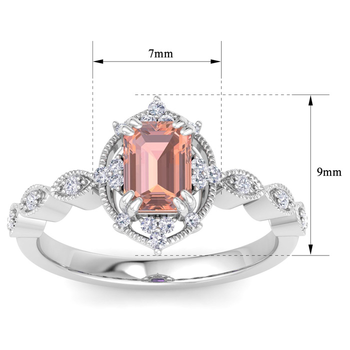 This morganite ring features one 7x5mm octagon shape morganite gemstone weighing approximately 3/4 carat. There are 22 sparkling round diamonds in I-J color, I1-I2 clarity totaling approximately 1/4 carat. Total carat weight is 1 carat. This ring is in 14 karat white gold.