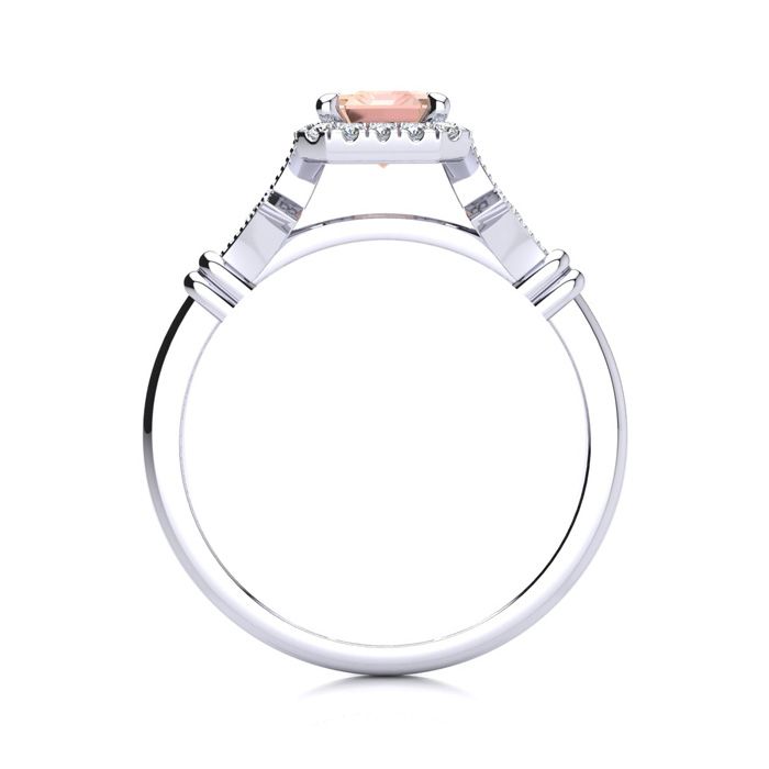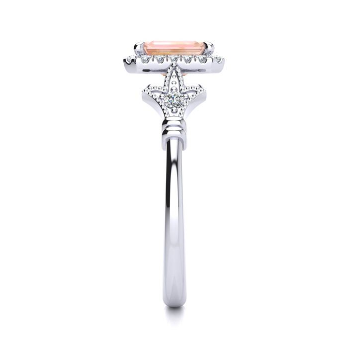This morganite ring features one 7x5mm emerald cut morganite gemstone at 9/10 carats. It is surrounded by 22 sparkling diamonds in a halo and down the band in H-I color, I1-I2 clarity at 1/4 carats. Total gem weight is 1 carats. This ring is crafted in 14 karat white gold.