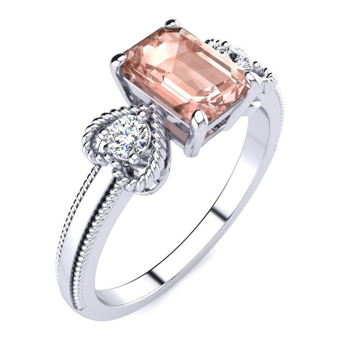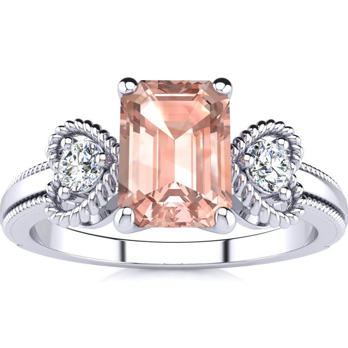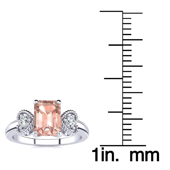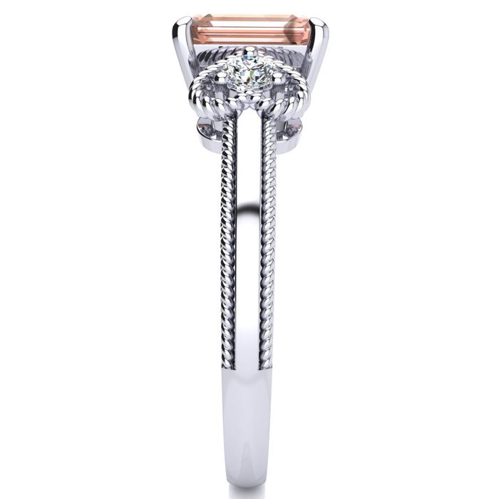 This morganite ring features one 7x5mm emerald cut morganite gemstone at 9/10 carats. It is surrounded by 2 sparkling diamonds in a heart in I-J color, I1-I2 clarity at 1/8 carats. Total gem weight is 1 carats. This ring is crafted in 10 karat white gold.