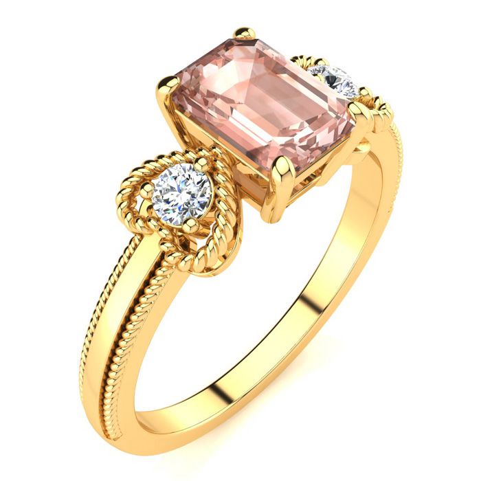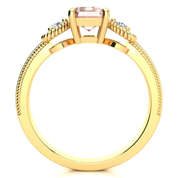 This morganite ring features one 7x5mm emerald cut morganite gemstone at 9/10 carats. It is surrounded by 2 sparkling diamonds in a heart in I-J color, I1-I2 clarity at 1/8 carats. Total gem weight is 1 carats. This ring is crafted in 10 karat yellow gold.