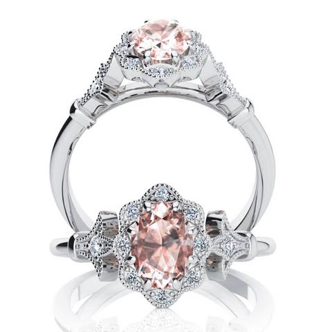 1 Carat Oval Shape Morganite and Halo Diamond Vintage Ring In 14 Karat White Gold