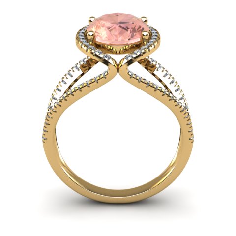 This morganite ring features one 10x8mm oval shape morganite gemstone at 2-1/4 carats. It is surrounded by 74 sparkling diamonds in a halo and down the split shank band in I-J color, I1-I2 clarity at 1/2 carats. Total gem weight is 2-3/4 carats. This ring is crafted in 14 karat yellow gold.
