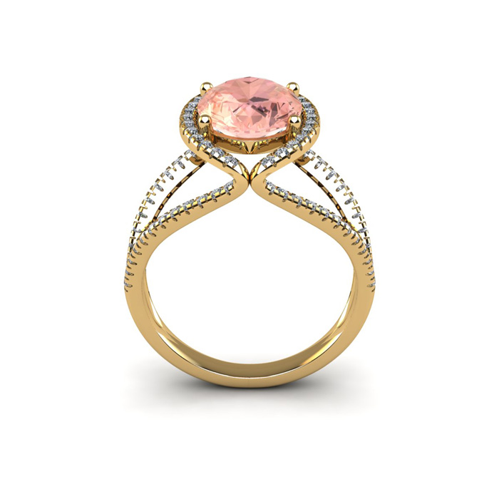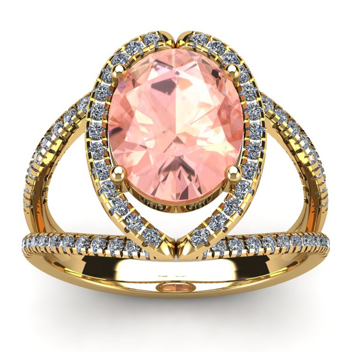 This morganite ring features one 10x8mm oval shape morganite gemstone at 2-1/4 carats. It is surrounded by 74 sparkling diamonds in a halo and down the split shank band in I-J color, I1-I2 clarity at 1/2 carats. Total gem weight is 2-3/4 carats. This ring is crafted in 14 karat yellow gold.