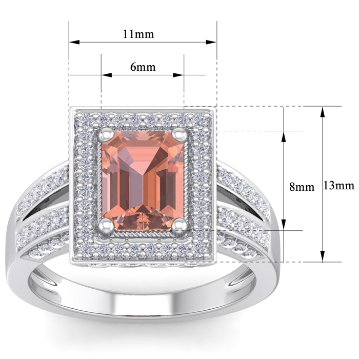This morganite ring features one 8x6mm emerald cut morganite gemstone at approximately 1-1/3 carats. It is surrounded by 80 sparkling diamonds in I-J color, I1-I2 clarity at 2/3 carat total weight. Total gem weight is approximately 2 carats. This ring is in 14 karat white gold.