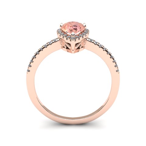 This morganite ring features one 7x5mm pear shape morganite gemstone at 5/8 carats. It is surrounded by 36 sparkling diamonds in a halo and down the band in I-J color, I1-I2 clarity at 1/8 carats. Total gem weight is 3/4 carats. This ring is crafted in 14 karat rose gold.