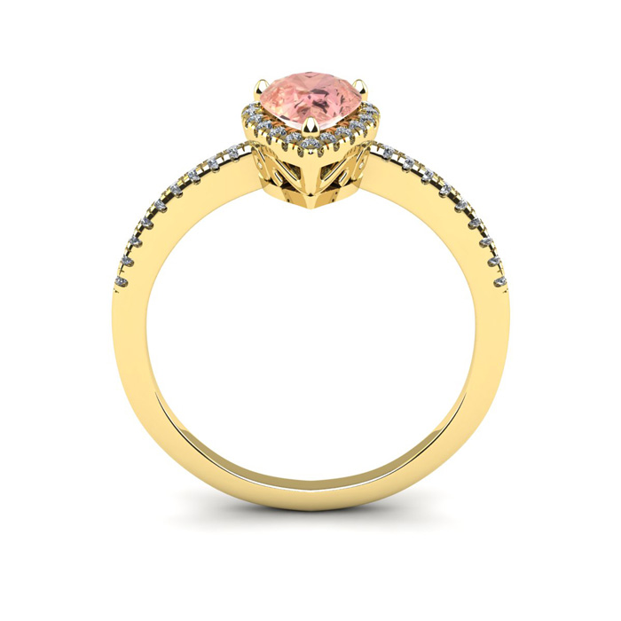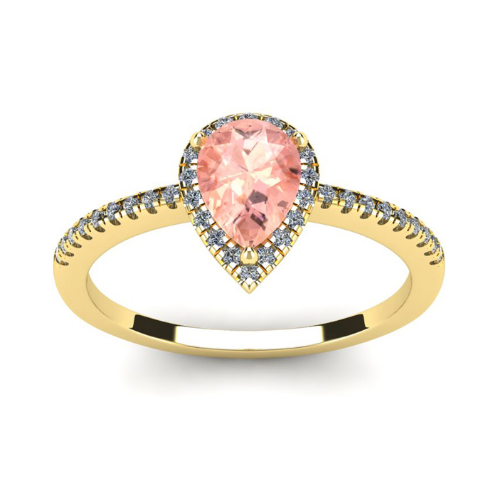This morganite ring features one 7x5mm pear shape morganite gemstone at 5/8 carats. It is surrounded by 36 sparkling diamonds in a halo and down the band in I-J color, I1-I2 clarity at 1/8 carats. Total gem weight is 3/4 carats. This ring is crafted in 14 karat yellow gold.