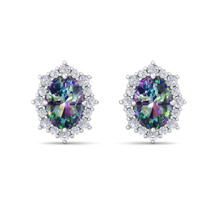 Retrograde Birthstones™ 2 1/2 Carat Oval Shape Mystic Topaz and Diamond Earrings In 14K White Gold