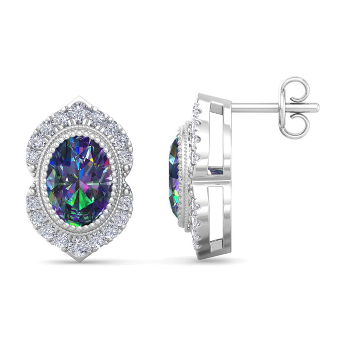 These gemstone earrings feature two 7x5mm oval shape mystic topaz gemstones each weighing approximately 1 carat. There are 36 sparkling diamonds in I-J color, I1-I2 clarity totaling approximately 1/2 carat. Total carat weight is 2 1/2 Carats. These earrings are in 14 karat white gold. *Retrograde Birthstones™ flips the idea of traditional birthstones. Wear your ½ birthday birthstone, your Retrograde Birthstone, “The Birthstone For Your Bad Side™.