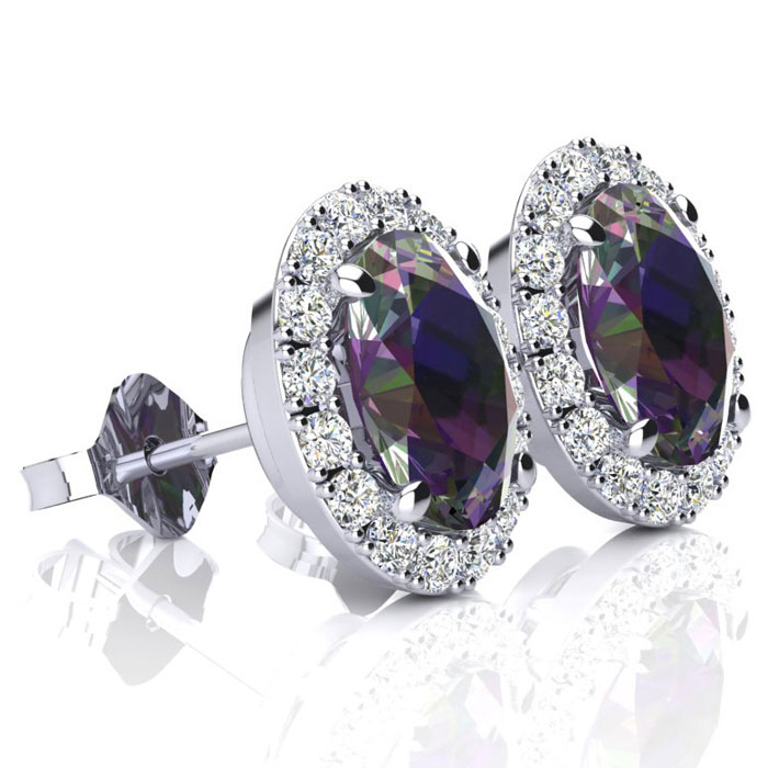 These stunning mystic topaz earrings features two 7x5mm oval shape mystic topaz gemstones each weighing approximately 1 carat. It is surrounded by 44 sparkling diamonds in I-J color, I1-I2 clarity at 1/4 carat. Total carat weight is 2 1/4 carats. These earrings are crafted in sterling silver and have comfortable and secure post with friction backs.