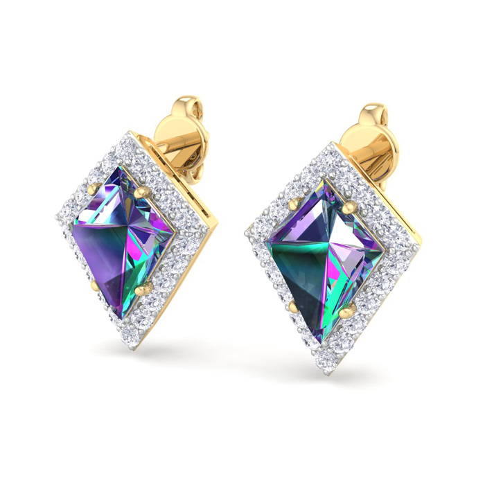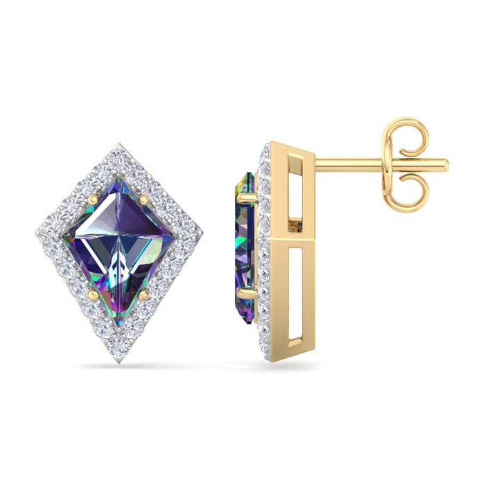 These gemstone earrings feature two 8x6mm kite shape mystic topaz gemstones each weighing approximately 1 carat. There are 40 sparkling diamonds in I-J color, I1-I2 clarity totaling approximately 1/5 carat. Total carat weight is 2 1/5 carats. These earrings are in 14 karat yellow gold. *Retrograde Birthstones™ flips the idea of traditional birthstones. Wear your ½ birthday birthstone, your Retrograde Birthstone, “The Birthstone For Your Bad Side™.