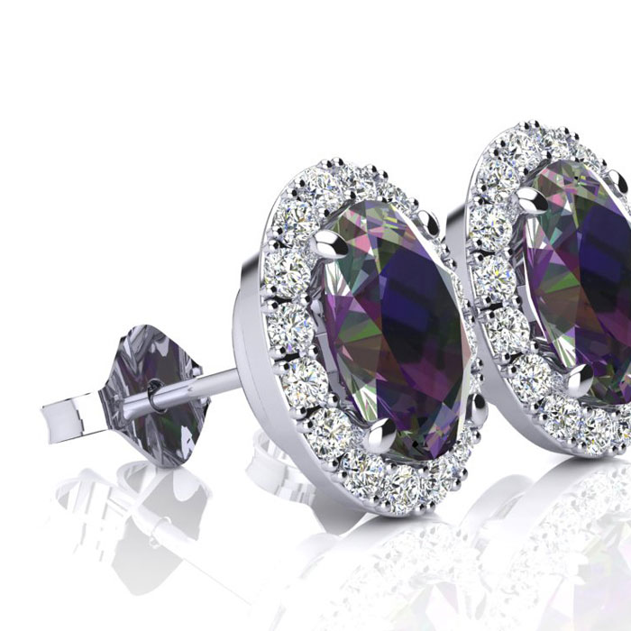 These stunning mystic topaz earrings features two 8x6mm oval shape mystic topaz gemstones each weighing approximately 1 1/4 carats. It is surrounded by 40 sparkling diamonds in I-J color, I1-I2 clarity at 1/3 carat. Total carat weight is 2 3/4 carats. These earrings are crafted in sterling silver and have comfortable and secure post with friction backs.