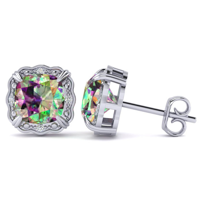 These stunning mystic topaz earrings features two 6x6mm cushion shape mystic topaz gemstones each weighing approximately 1 carat. It is surrounded by 8 sparkling diamonds in I-J color, I1-I2 clarity at 0.04 carats. Total carat weight is 2.04 carats. These earrings are crafted in sterling silver and have comfortable and secure post with friction backs.