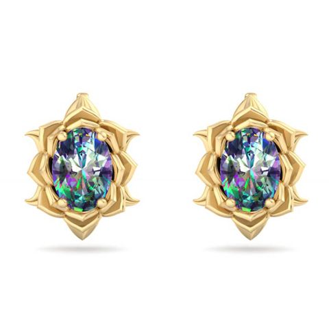 2 Carat Oval Shape Mystic Topaz Ornate Stud Earrings In 14K Yellow Gold