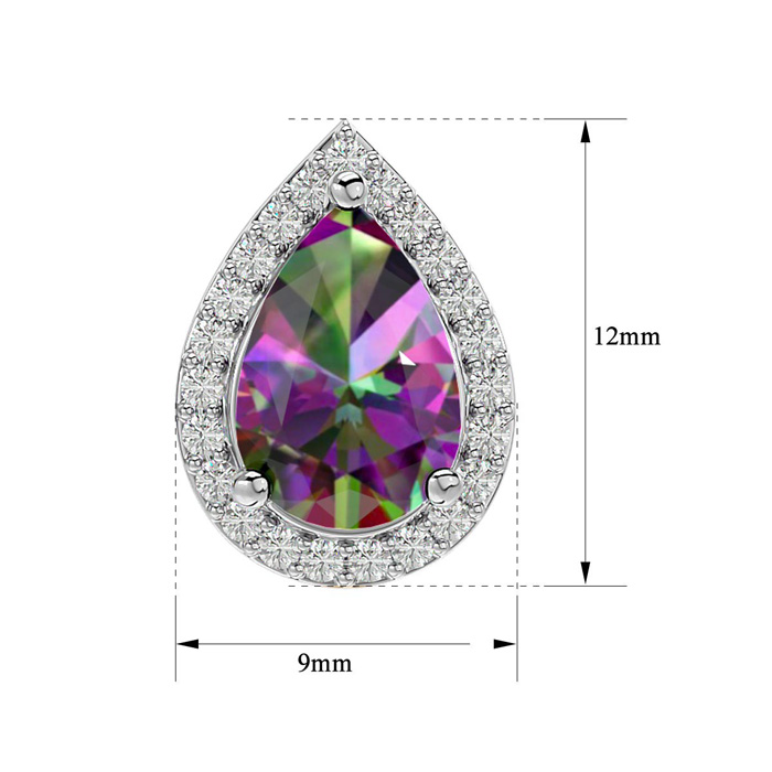 These stunning mystic topaz earrings features two 9x6mm pear shape mystic topaz gemstones each weighing approximately 1 1/3 carats. It is surrounded by 48 sparkling diamonds in I-J color, I1-I2 clarity at 1/4 carat. Total carat weight is 3 carats. These earrings are crafted in sterling silver and have comfortable and secure post with friction backs. *Retrograde Birthstones™ flips the idea of traditional birthstones. Wear your ½ birthday birthstone, your Retrograde Birthstone, “The Birthstone For Your Bad Side™.