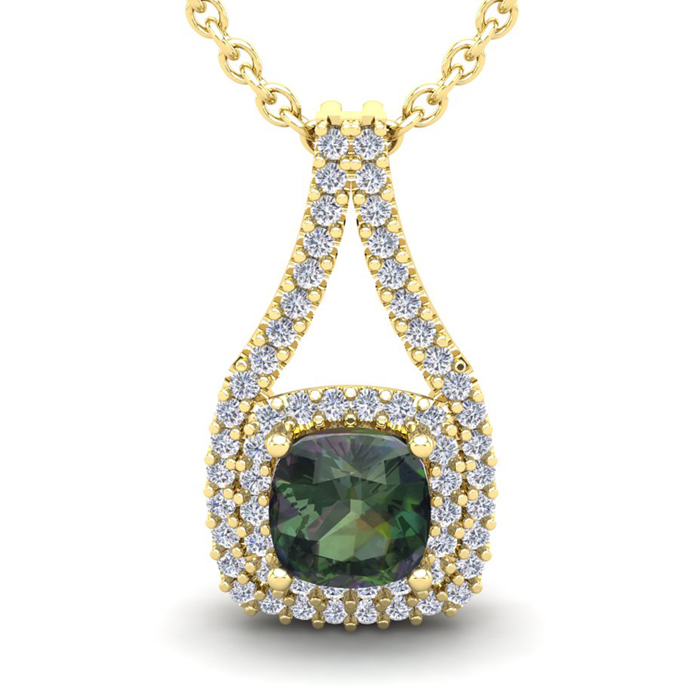 1-1/2 Carat Cushion Shape Mystic Topaz Necklace With Double Diamond Halo In 14 Karat Yellow Gold, 18 Inches
