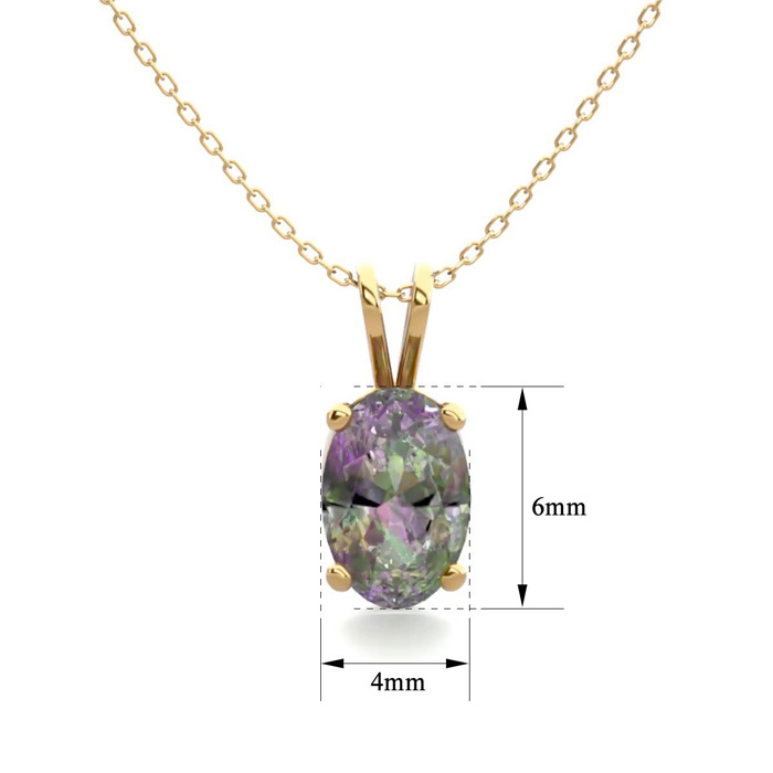 This mystic topaz necklace features one 6x4mm oval shape mystic topaz gemstone at approximately 1/2 carats. This necklace is crafted in 14 karat yellow gold plating over sterling silver. The chain is 18 inches with a spring ring clasp.
