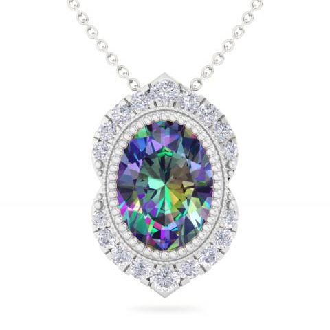 1-3/4 Carat Oval Shape Mystic Topaz Necklace With Diamond Halo In 14 Karat White Gold, 18 Inches