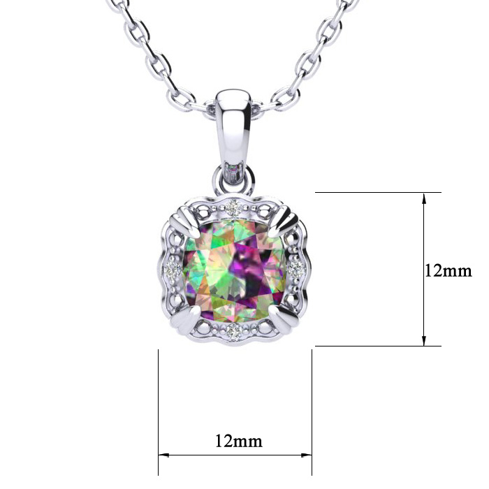 This mystic topaz necklace features one 8x8mm cushion shape mystic topaz gemstone at approximately 2-1/2 carats. There are 4 sparkling diamonds that are I-J color, I1-I2 clarity at approximately 1/25 carats. Total gem weight is approximately 2-1/2 carats. This necklace is crafted in 10 karat white gold. The chain is 18 inches with a spring ring clasp.