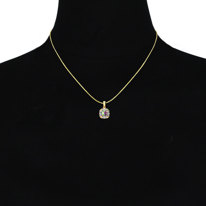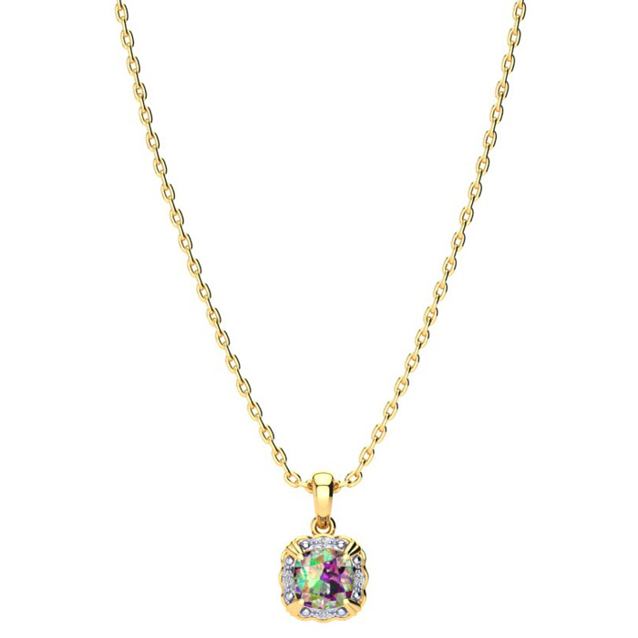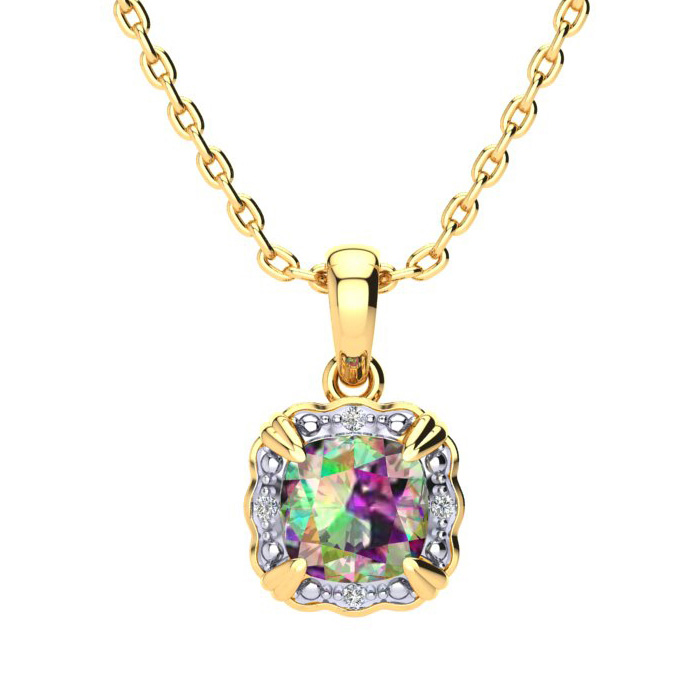 This mystic topaz necklace features one 8x8mm cushion shape mystic topaz gemstone at approximately 2-1/2 carats. There are 4 sparkling diamonds that are I-J color, I1-I2 clarity at approximately 1/25 carats. Total gem weight is approximately 2-1/2 carats. This necklace is crafted in 10 karat yellow gold. The chain is 18 inches with a spring ring clasp.