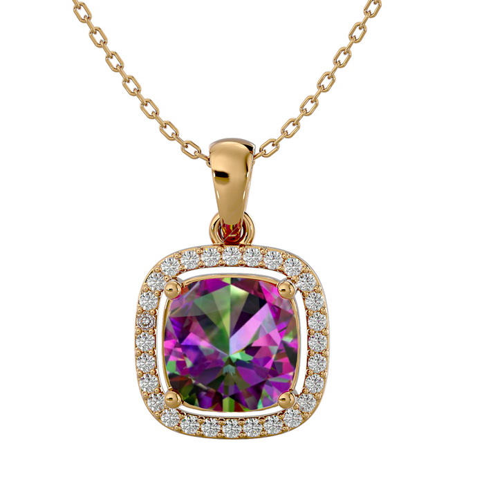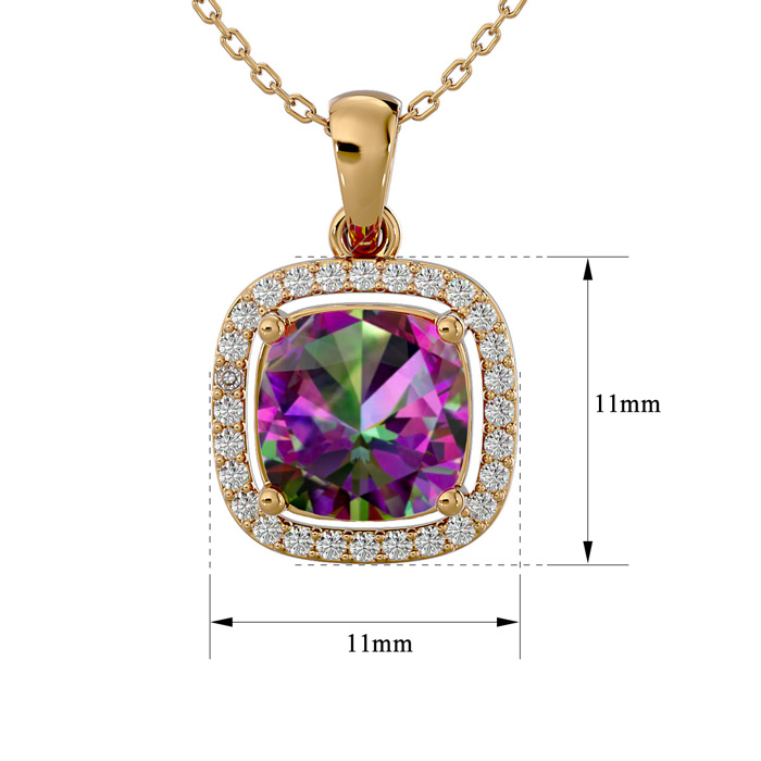 2-1/4 Carat Cushion Shape Mystic Topaz Necklace With Diamond Halo In 14 Karat Yellow Gold, 18 Inches