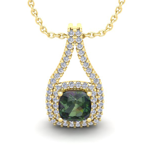 This mystic topaz necklace features one 7x7mm cushion shape mystic topaz gemstone at approximately 1-3/4 carats. There are 58 sparkling diamonds that are I-J color, SI2-I1 clarity at approximately 1/2 carats. Total gem weight is approximately 2-1/4 carats. This necklace is crafted in 14 karat yellow gold. The chain is 18 inches with a spring ring clasp.
