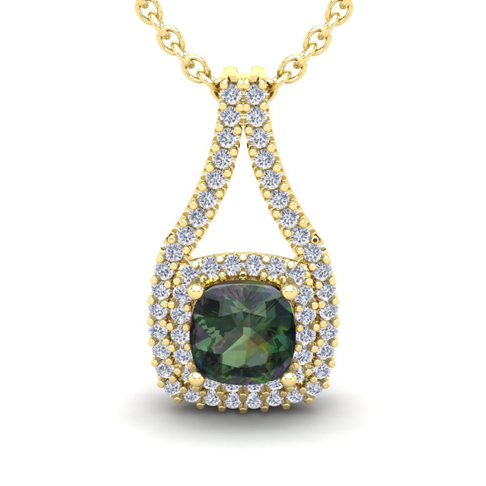 2-1/4 Carat Cushion Shape Mystic Topaz Necklace With Double Diamond Halo In 14 Karat Yellow Gold, 18 Inches