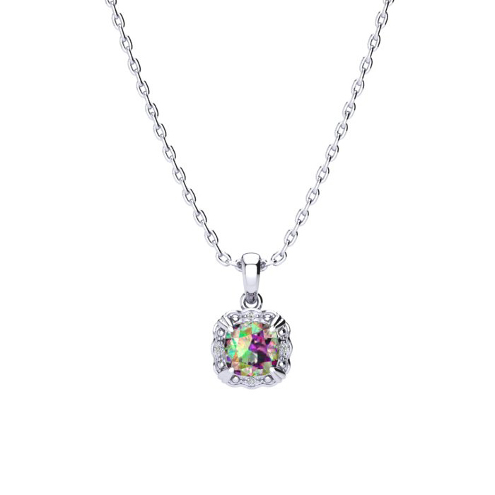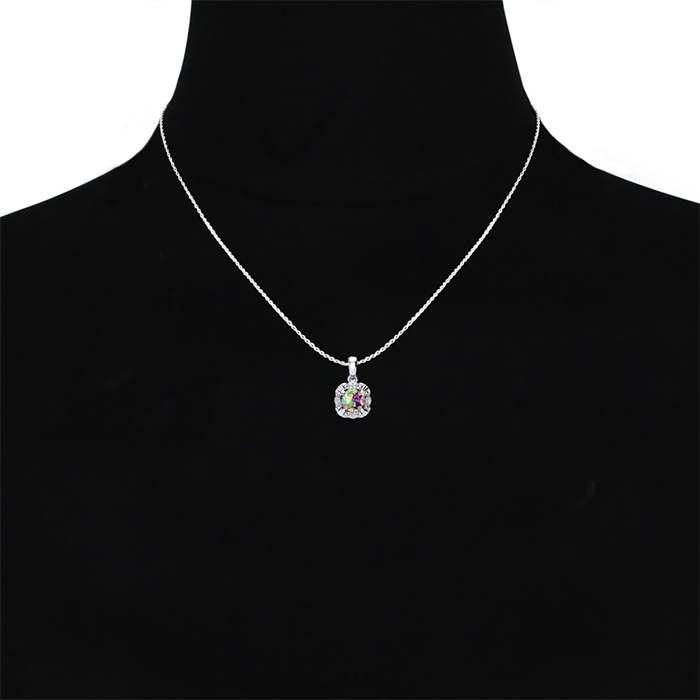 This stunning mystic topaz necklace features one 8x8mm cushion shape mystic topaz gemstone weighing approximately 2 carats. It is surrounded by 4 sparkling diamonds in I-J color, I1-I2 clarity at 0.04 carats. This necklace is crafted in sterling silver and comes with an 18 inch cable chain with spring ring clasp.
