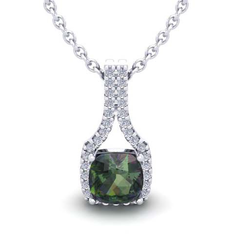 This mystic topaz necklace features one 7x7mm cushion shape mystic topaz gemstone at approximately 1-3/4 carats. There are 33 sparkling diamonds that are I-J color, SI2-I1 clarity at approximately 1/3 carats. Total gem weight is approximately 2 carats. This necklace is crafted in 14 karat white gold. The chain is 18 inches with a spring ring clasp.
