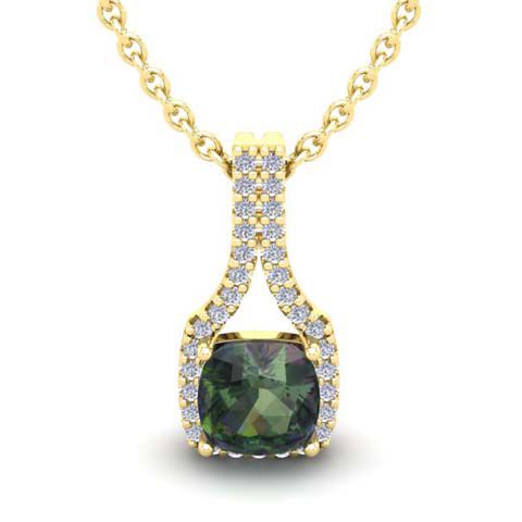 This mystic topaz necklace features one 7x7mm cushion shape mystic topaz gemstone at approximately 1-3/4 carats. There are 33 sparkling diamonds that are I-J color, SI2-I1 clarity at approximately 1/3 carats. Total gem weight is approximately 2 carats. This necklace is crafted in 14 karat yellow gold. The chain is 18 inches with a spring ring clasp.