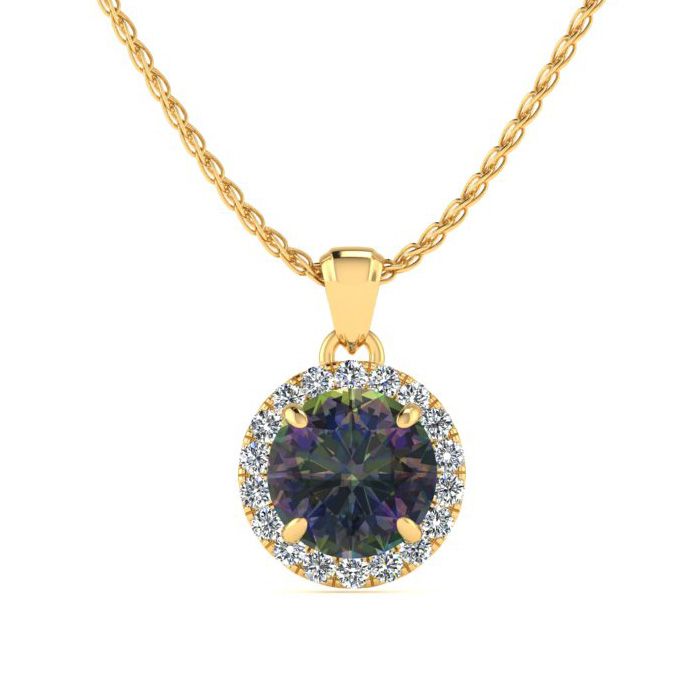 3/4 Carat Round Shape Mystic Topaz Necklace With Diamond Halo In 14 Karat Yellow Gold, 18 Inches