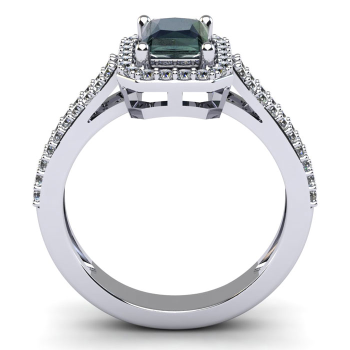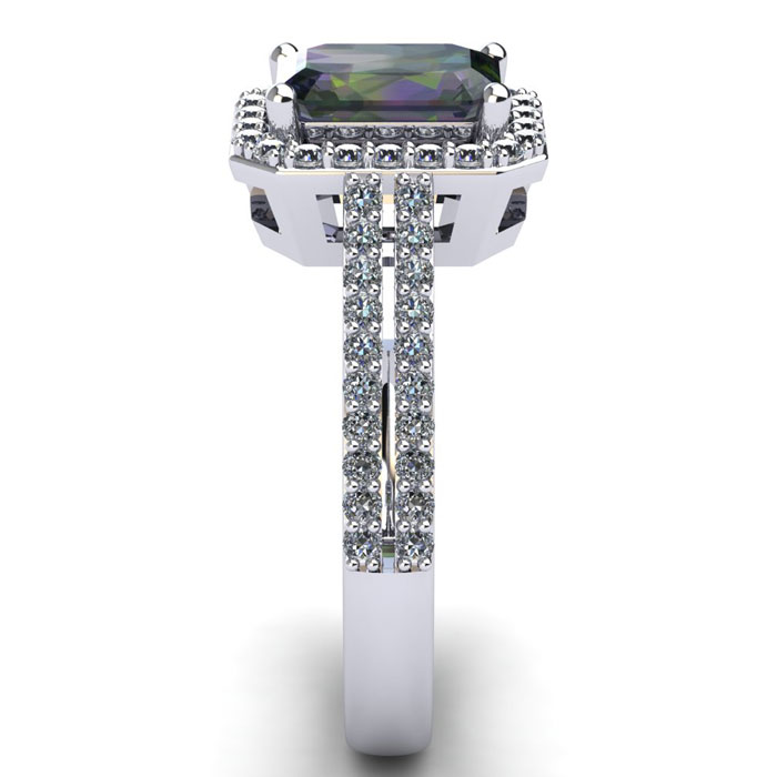 This mystic topaz ring features one 7x5mm emerald cut mystic topaz gemstone. It is surrounded by 56 sparkling diamonds totaling 0.40 carats in I-J color, I1-I2 clarity. Total carat weight is approximately 1 1/2 carats. This ring is in sterling silver.