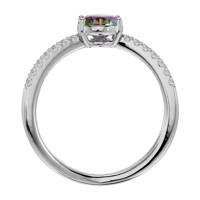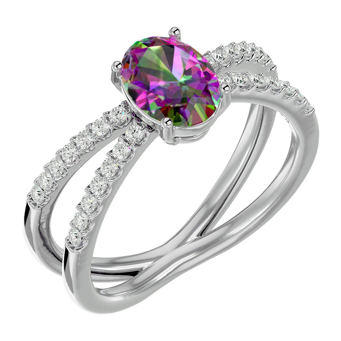 This mystic topaz ring features one 8x6mm oval shape mystic topaz gemstone. It is surrounded by 28 sparkling diamonds totaling 1/4 carat in I-J color, I1-I2 clarity. Total carat weight is approximately 1 1/2 carats. This ring is in sterling silver.