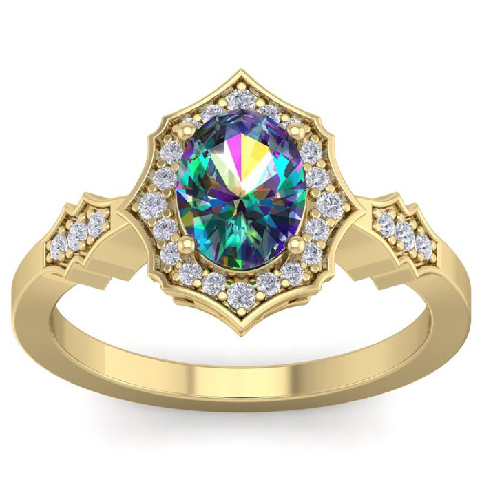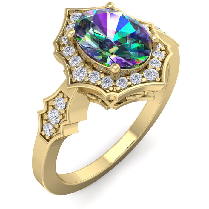 Retrograde Birthstones™ 1-1/3 Carat Oval Shape Mystic Topaz Ring And Diamonds In 14 Karat Yellowe Gold