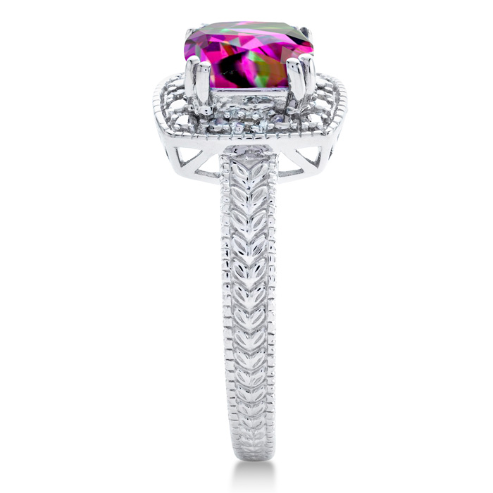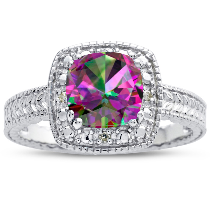 This mystic topaz ring features one 7x7mm cushion shape mystic topaz gemstone. It is surrounded by 4 sparkling diamonds totaling 0.02 carats in I-J color, I1-I2 clarity. Total carat weight is approximately 1 1/4 carats. This ring is in sterling silver.