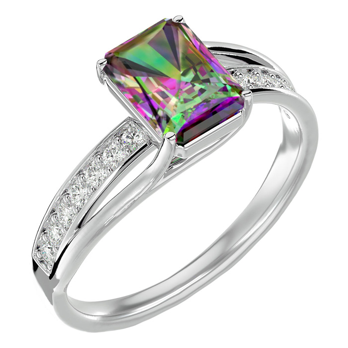 This mystic topaz ring features one 8x6mm emerald shape mystic topaz gemstone. It is surrounded by 14 sparkling diamonds totaling 1/5 carat in I-J color, I1-I2 clarity. Total carat weight is approximately 1 3/4 carats. This ring is in sterling silver.