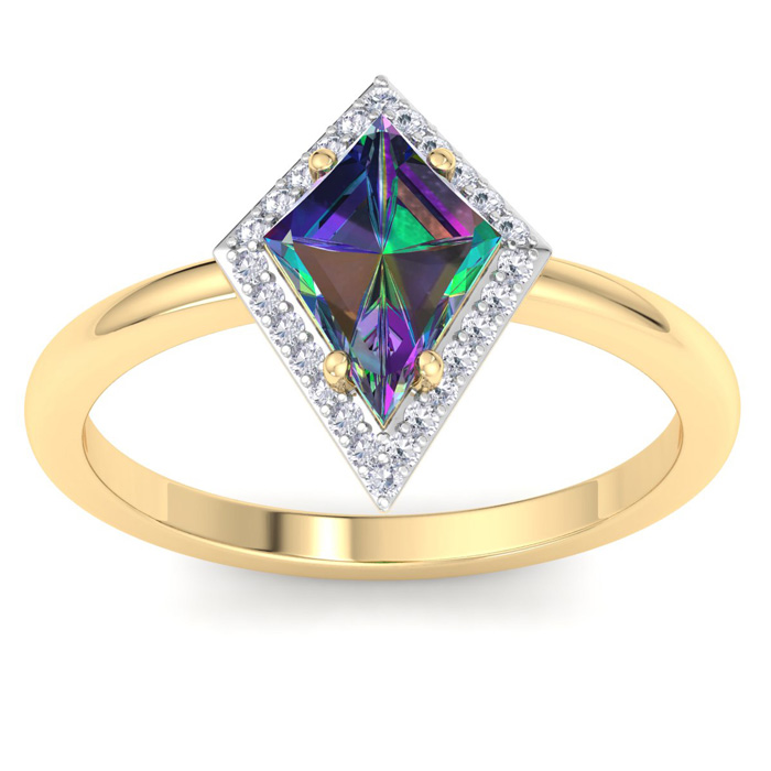 This mystic topaz ring features one 10x7mm kite shape mystic topaz gemstone at approximately 1-1/2 carats. There are 26 diamonds of I-J color, I1-I2 clarity at approximately 1/4 carats total. Total gem weight is approximately 1-3/4 carats. This ring is crafted in 14 karat yellow gold.