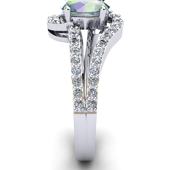 This mystic topaz ring features one 7x5mm oval shape mystic topaz gemstone. It is surrounded by 42 sparkling diamonds totaling 0.40 carats in I-J color, I1-I2 clarity. Total carat weight is approximately 1.40 carats. This ring is in sterling silver.