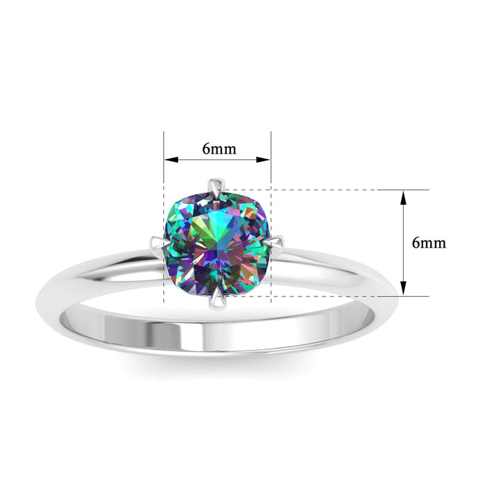 This mystic topaz ring features one 6mm cushion shape mystic topaz gemstone at approximately 1 carats. This ring is crafted in 14 karat white gold.
