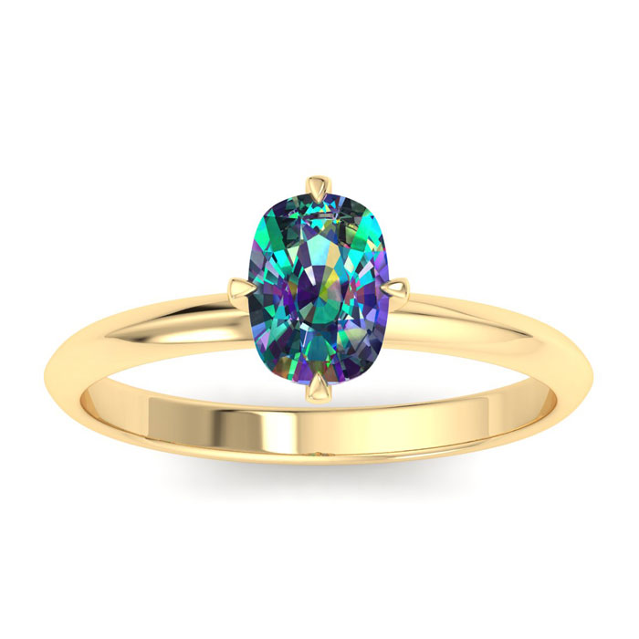 This mystic topaz ring features one 7x5mm cushion shape mystic topaz gemstone at approximately 1 carats. This ring is crafted in 14 karat yellow gold.
