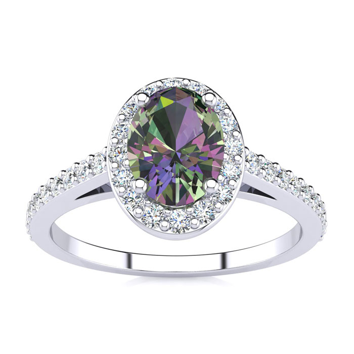 This mystic topaz ring features one 7x5mm oval shape mystic topaz gemstone. It is surrounded by 38 sparkling diamonds totaling 1/3 carat in I-J color, I1-I2 clarity. Total carat weight is approximately 1 carat. This ring is in sterling silver.